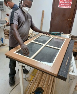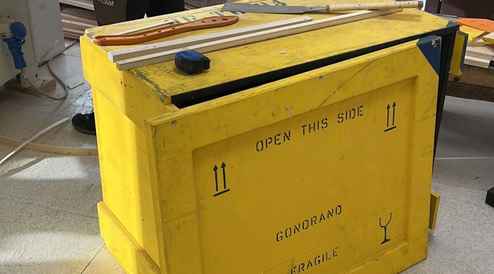 For the construction, artisans from Echo Labs’ permanent workshop used various materials recovered from FERCAM’s logistics operations: crates previously used for transporting artworks, wood from freight packaging, PVC from truck tarpaulins, and transparent panels originally installed in offices during the pandemic.