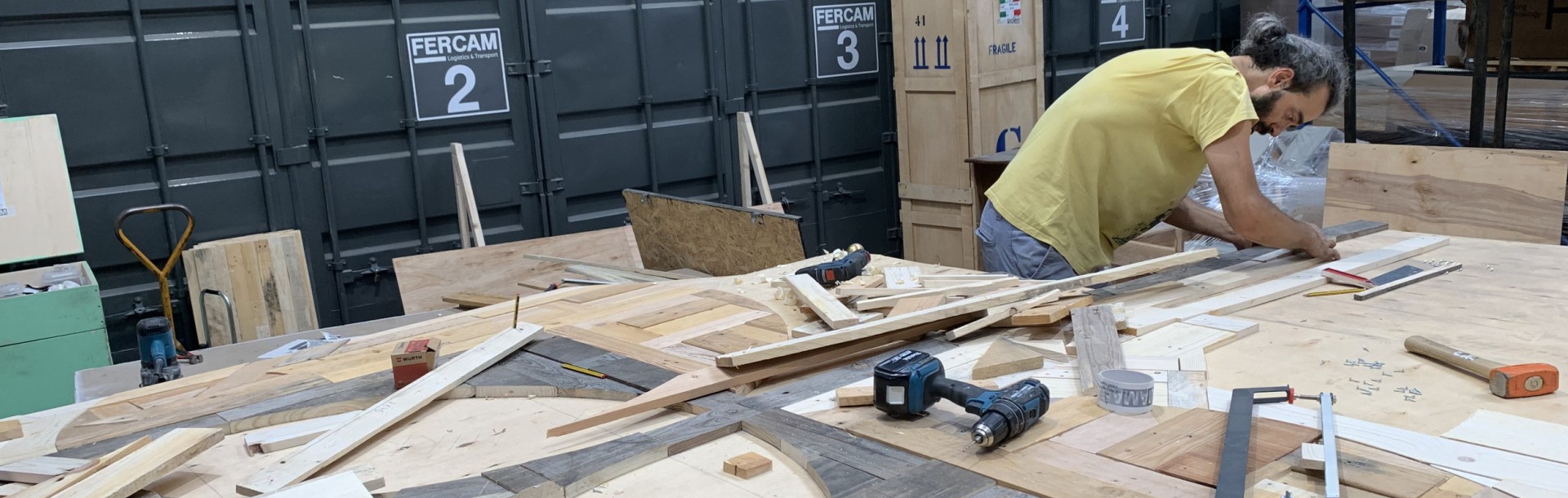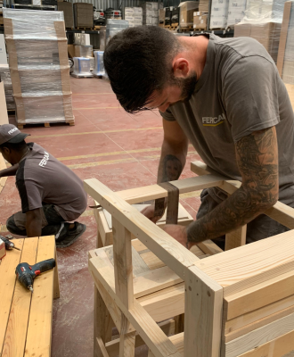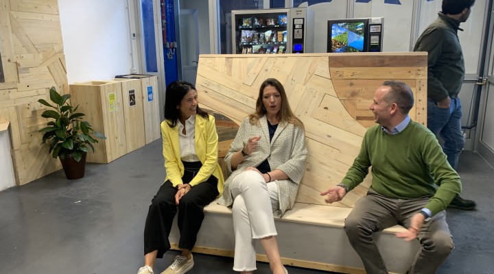 We approached this design challenge by using recycled materials to help reduce CO₂ emissions. The project also provided an opportunity to support artisan workshops in the fields of design and carpentry, promoting green solutions. As part of this initiative, the break room was furnished with stools, recycling bins, and a mobile bench. To create a warm and welcoming atmosphere, the original aluminum and glass walls were clad in wood, striking a balance between aesthetics and functionality.
