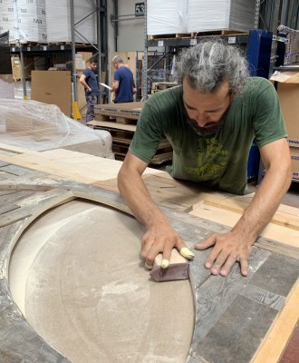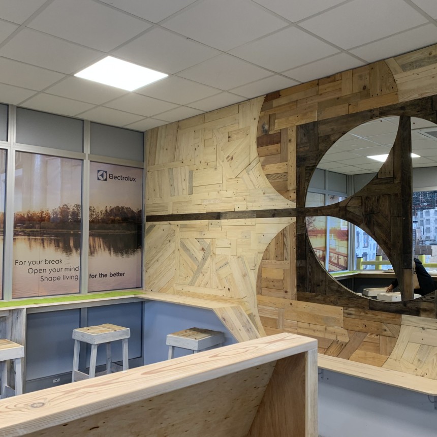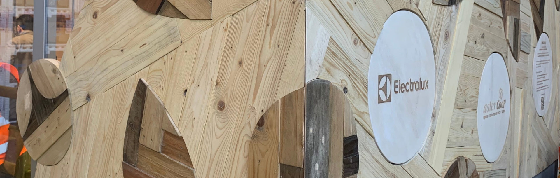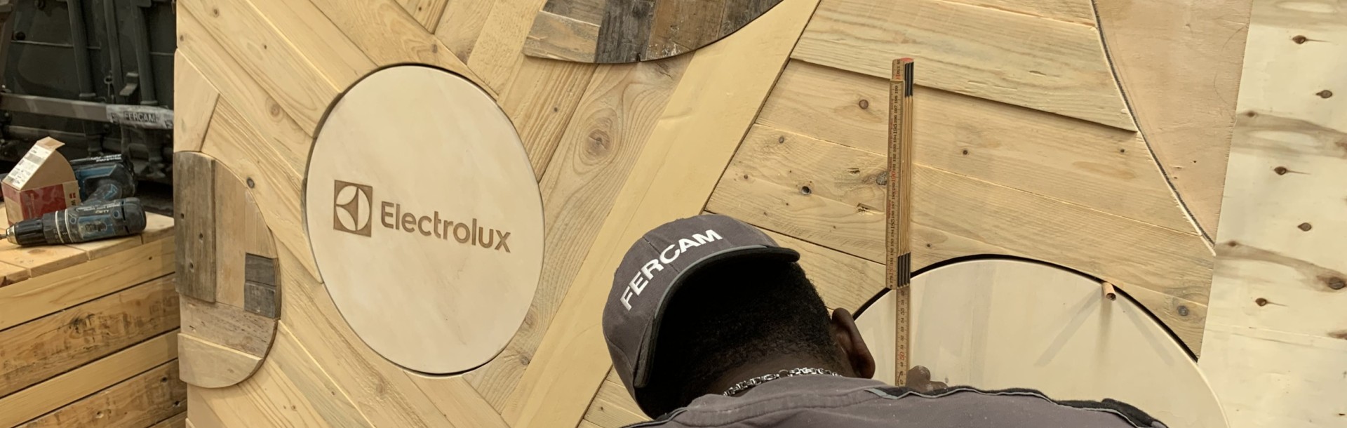 A feature wall was installed inside the room, equipped with shelving and showcasing the Electrolux logo—crafted in a combination of wood and mirror for a high-definition effect. This was achieved using the marquetry technique, which repurposes small wood pieces and allows for greater precision in the final result.