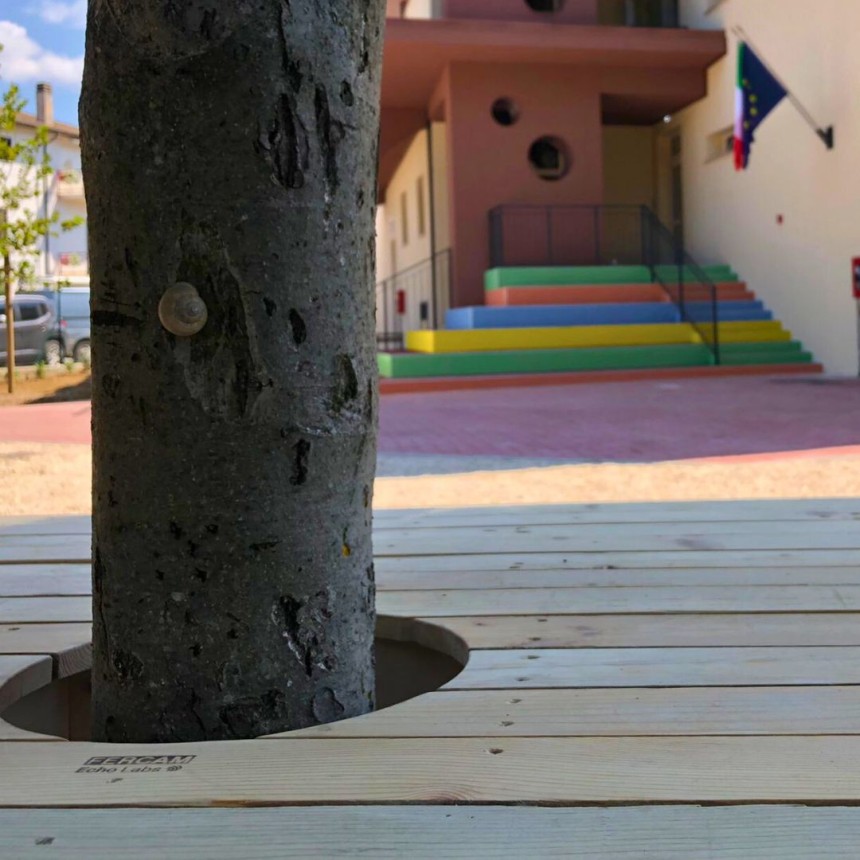 The school has just completed post-earthquake renovations and will reopen with an exciting new addition: thanks to the creativity of teachers, children, and carpenters—and through the use of repurposed materials—the children will have access to a brand-new, almost magical space. It features child-sized stools and two tables, one of which was built around a tree, as if they had grown up together and never let go.