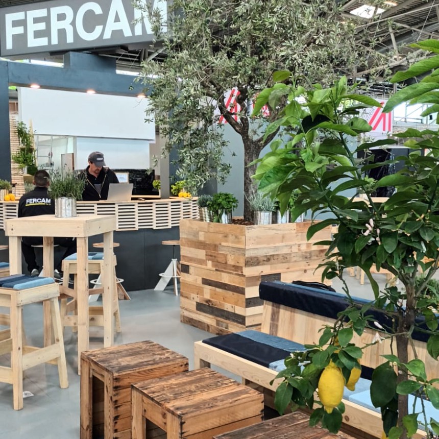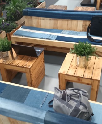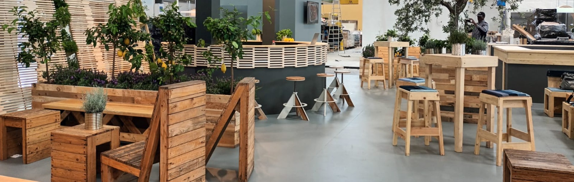 Echo Labs’ woodworking artisans crafted tables, stools, chairs, benches, counters, and planters using an upcycling approach—transforming materials recovered from the logistics supply chain into functional furniture pieces. The planters, filled with a variety of plants and shrubs, brought a touch of greenery and vitality to the event, introducing a sense of biodiversity into an indoor space.