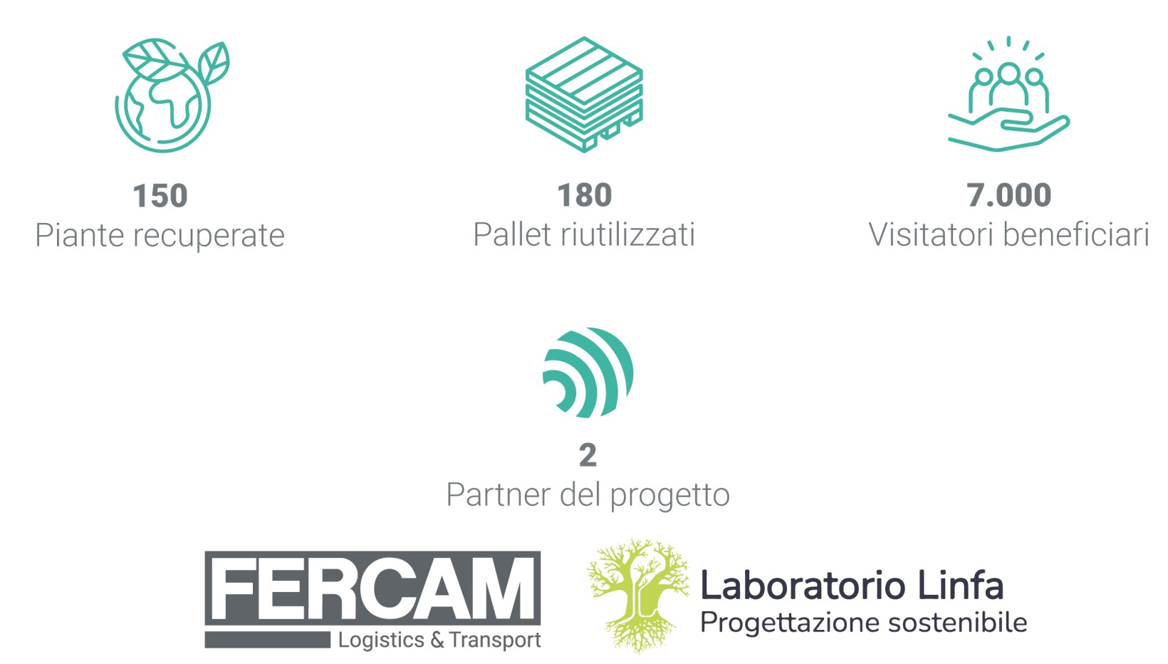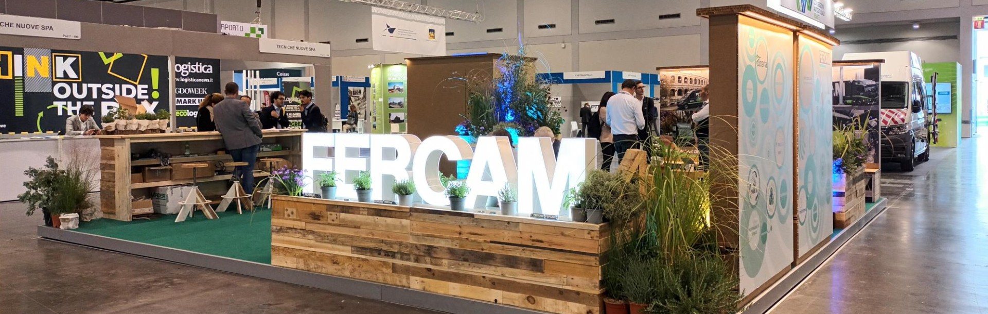 In occasione della Green Logistics Expo di Padova, lo stand FERCAM SpA ha ospitato uno stand espositivo realizzato interamente con materiali di riuso (cartone e legno di recupero da pallet) e isole di verde costituite da piante aromatiche, erbe e fiori che, conclusa la fiera, sono state messe a dimora in aree dedicate alla biodiversità ospitate nelle Filiali FERCAM.