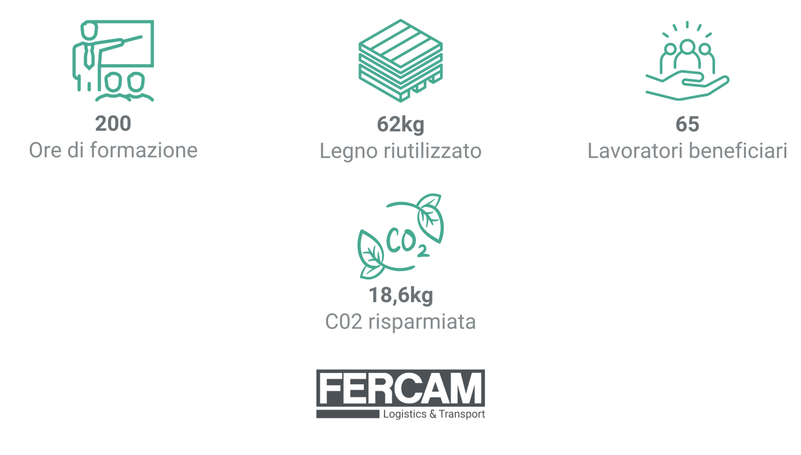 Abbiamo scelto di utilizzare legno proveniente da pallet e casse FERCAM, nonché legno recuperato da una produzione cinematografica, contribuendo così a ridurre il consumo di risorse e minimizzare lo smaltimento di materiali.
